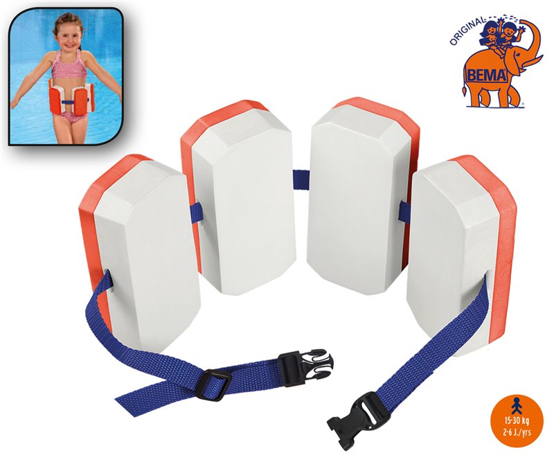 Plovací pomůcka pro výuku plavání BEMA s plováky z EVA pěny, regulovatelný nylonový pásek. Pro děti od 15 do 30 kg (od 2 do 6 let). POZOR! Nechrání před utonutím! Používat pouze pod neustálým odborným dohledem! Tato plavecká pomůcka se skládá z několika částí. Za účelem dosažení maximálního vztlaku je nutno používat všechny části.
