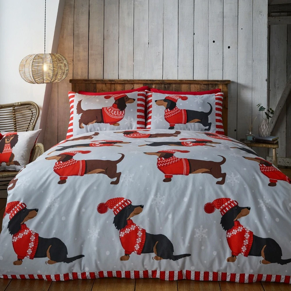 Tato sada povlečení na jednolůžko s motivem jezevčíka s klobáskovým psíkem je nutností pro každého, kdo je posedlý psíky! Design zahrnuje kolekci roztomilých psů oblečených v červenobílých vánočních svetrech a čepicích na měkkém šedém pozadí s bílým vzorem sněhových vloček. Tato sada ložního prádla je vyrobena ze směsi polybavlny a lze ji prát v pračce a sušit v sušičce na chladném místě.